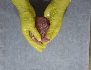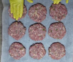 - Oblikuj pljeskavice: podeli smesu na 4–6 jednakih delova i formiraj šake mesa u tanje pljeskavice.