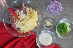 - U činiji sjedini sve sastojke: mleveno meso, luk, beli luk, alevu papriku, so, biber, gaziranu vodu i ulje. Dobro izmešaj rukama da se sve poveže.